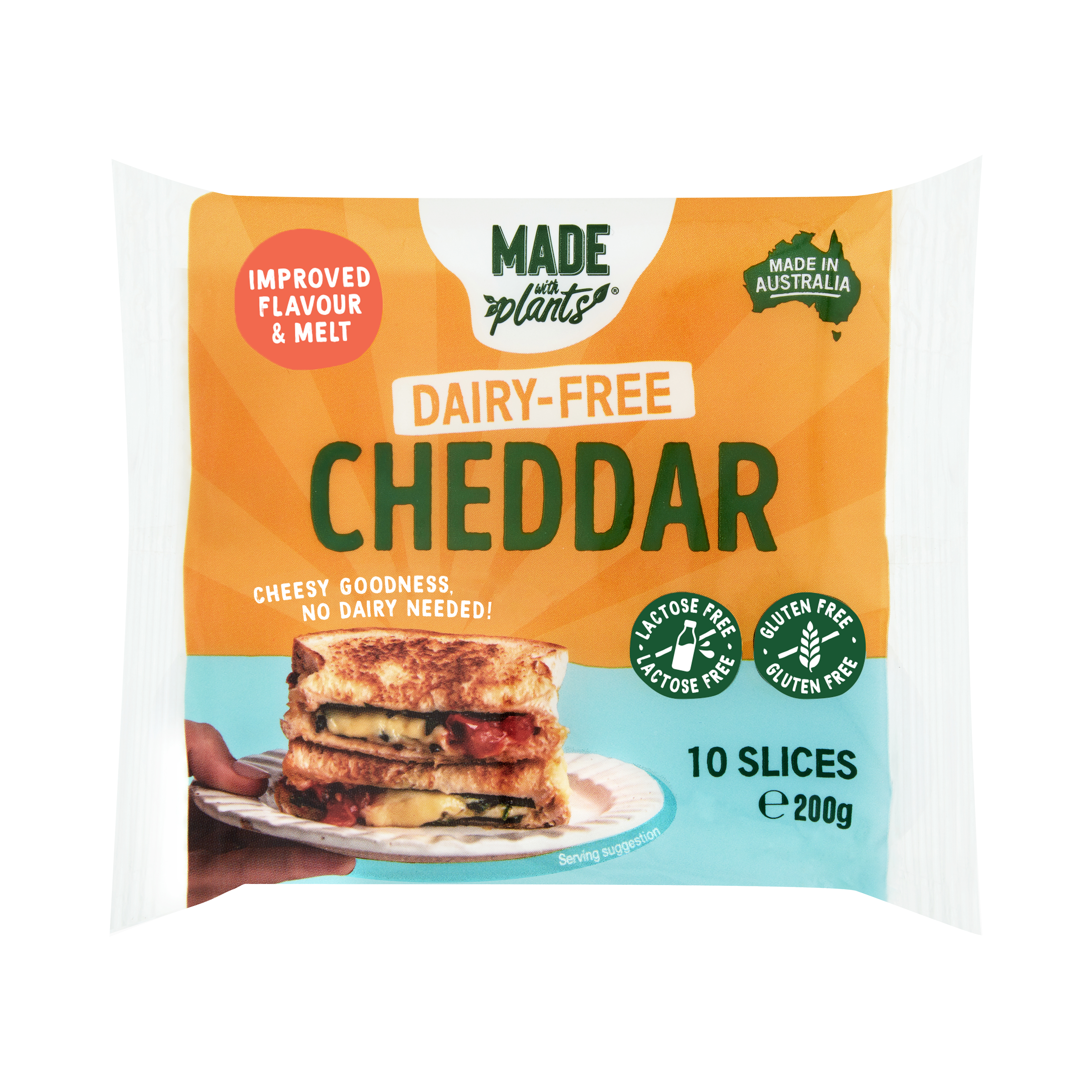 Made with plant-based ingredients, our Cheddar Slices taste, smell and cook like traditional dairy cheese. Perfect for burgers, wraps, or the ultimate grilled cheese sandwich.